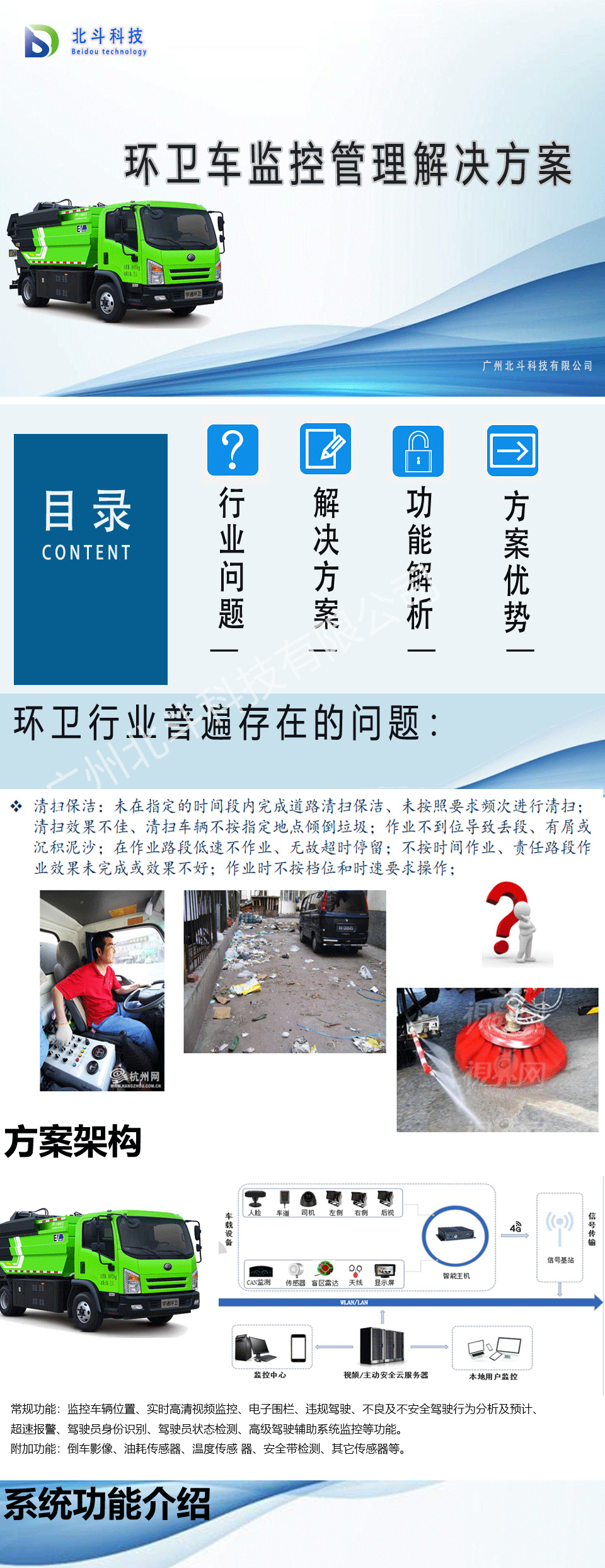 以上是我们广州北斗科技有限公司,一个智慧环卫车行业管理系统的解决方案示例,具体的方案应根据实际需求和情况进行定制化设计。在实施过程中,可以与专业的技术团队合作,确保系统的顺利建设和有效运行。